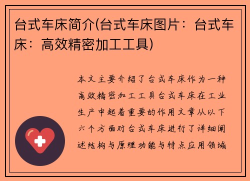 山东台实数控机床有限公司,这个名字或许对大部分人来说还是一个陌生的存在。一旦你了解了这家公司的创新理念和强大实力,你将会被它的精准制造所震撼,被它引领未来的决心所打动。 精准制造,这是山东台实数控机床有限公司一直以来的追求和坚持。他们以独特的技术和创新的设计,打造出了一系列高精度、高效率的数控机床产品,赢得了国内外市场的广泛认可。无论是航空航天、汽车制造、还是电子通讯等行业,山东台的产品都能够满足...